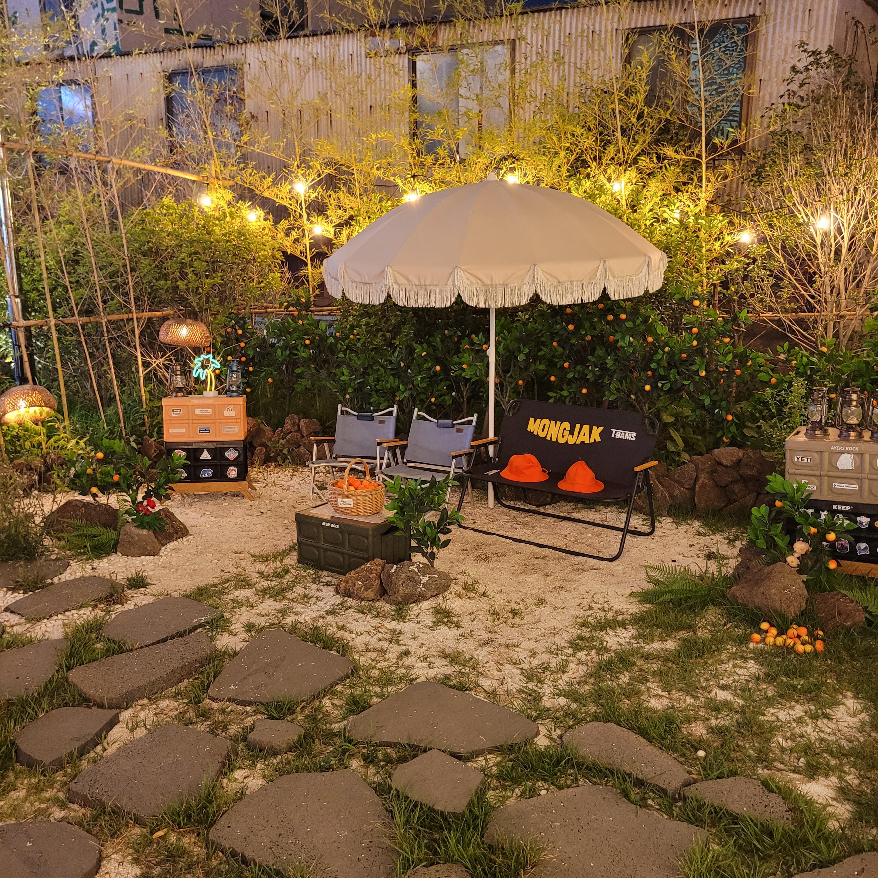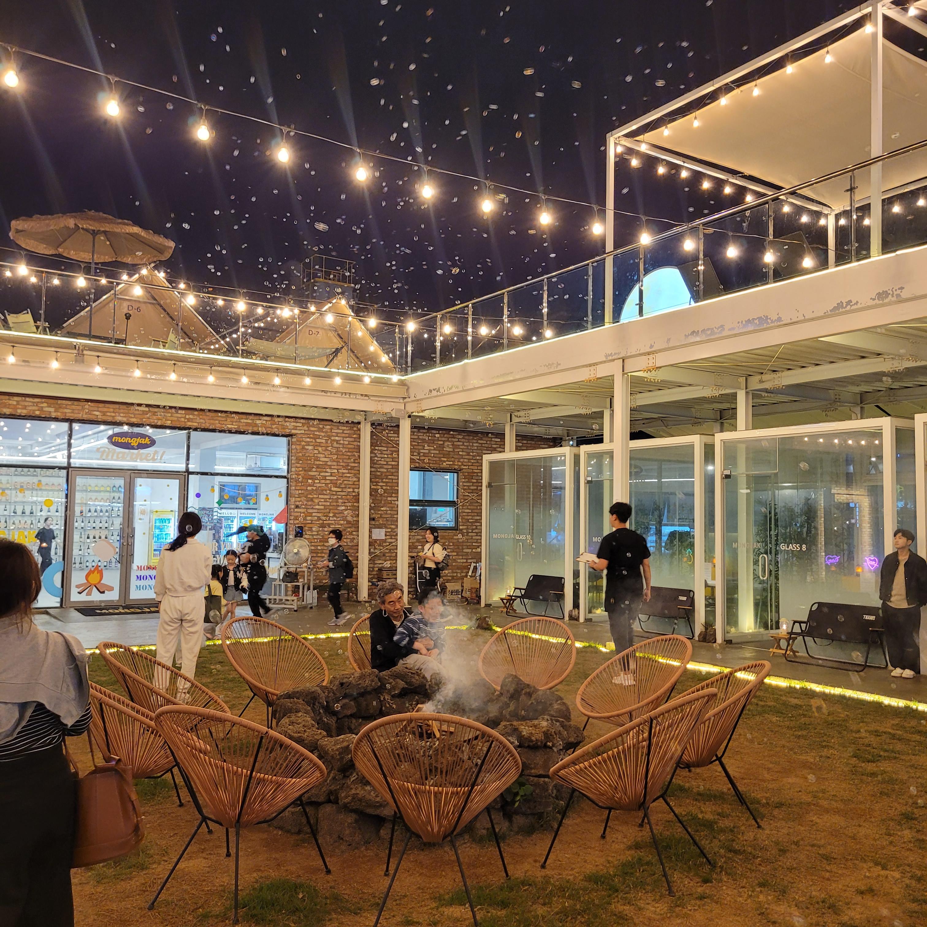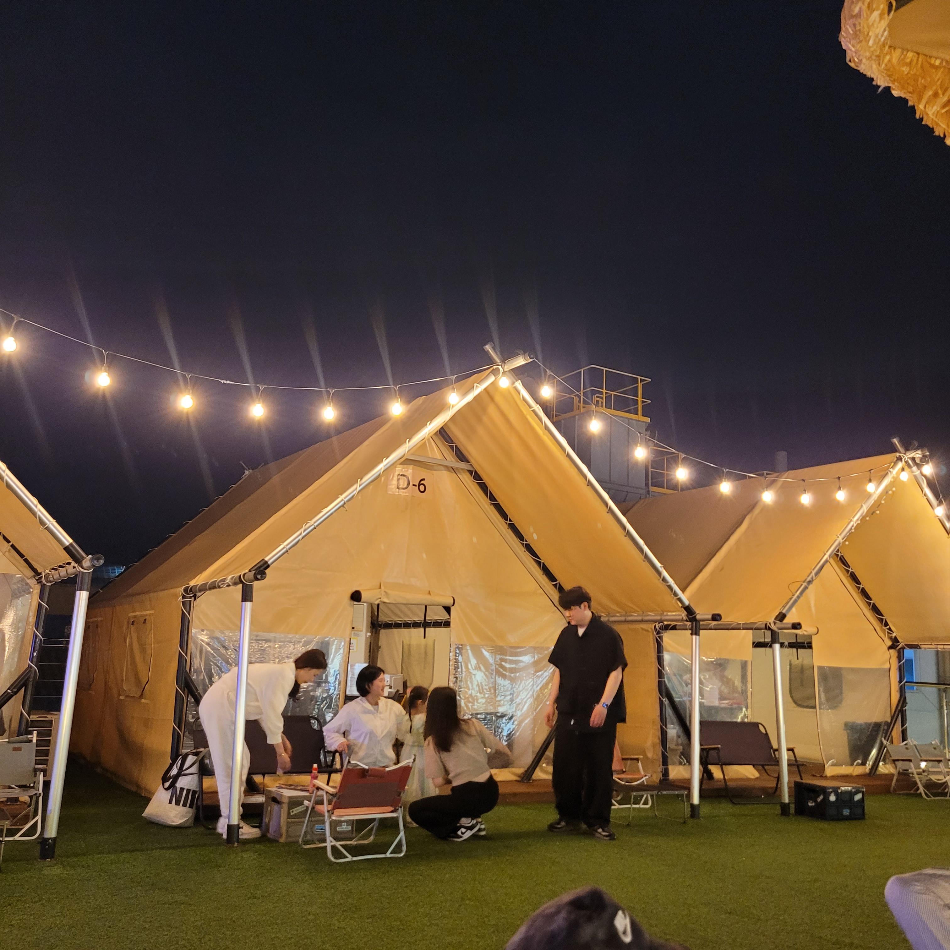 안에 냉장고, 에어컨, 블루투스 스피커 등등 글램핑 컨셉의 제품들이 가득하여