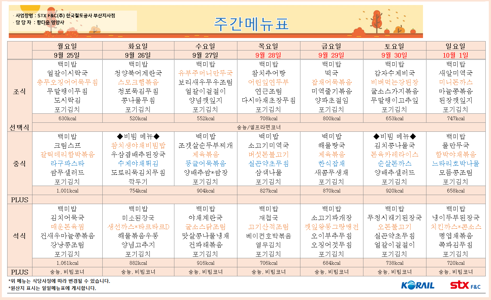 | 23-10-09 ~ 23-10-15 부산역 직원식당 메뉴 (1) | 2023.10.08 |