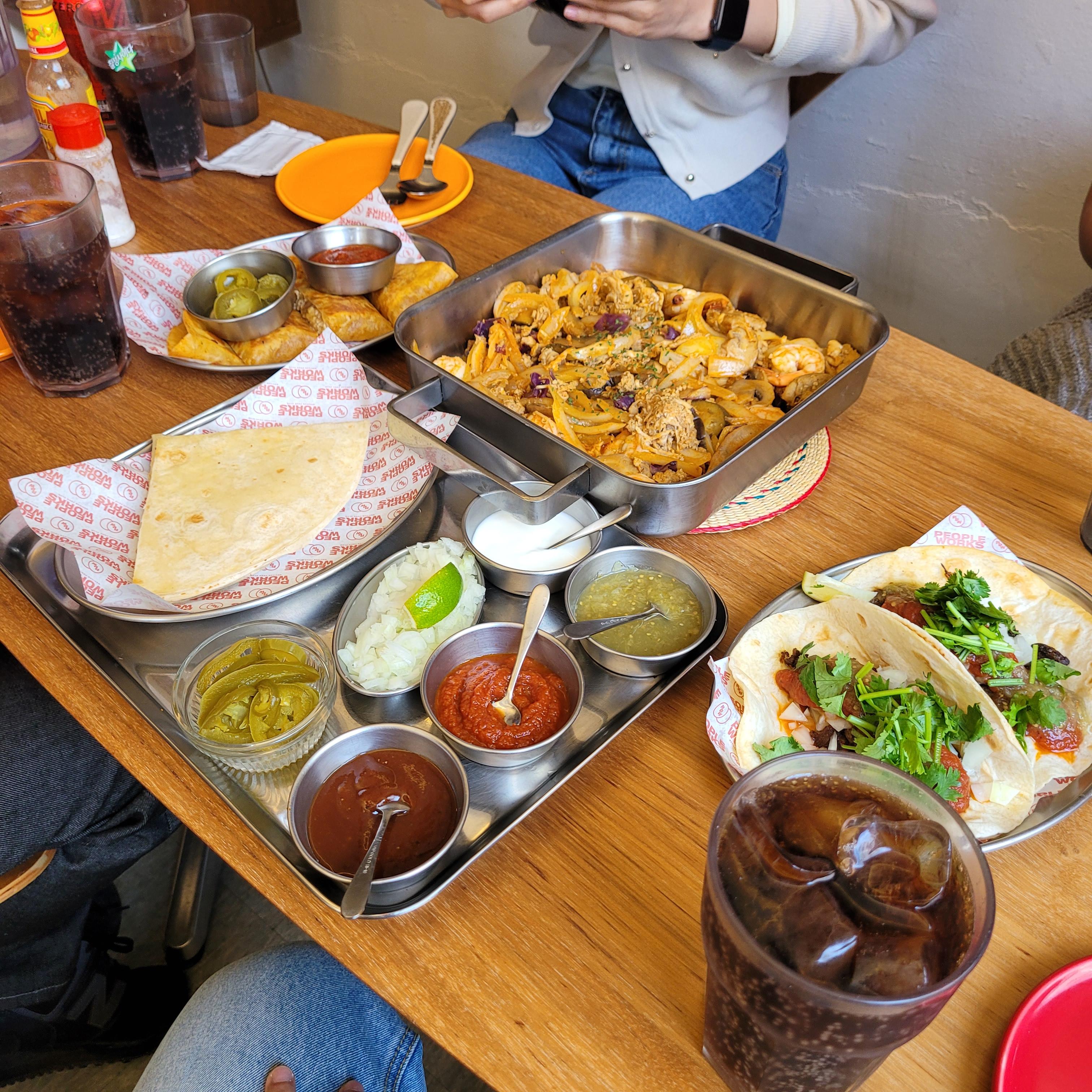 시킨 메뉴는 왼쪽부터 타코, 퀘사디아, 파히타