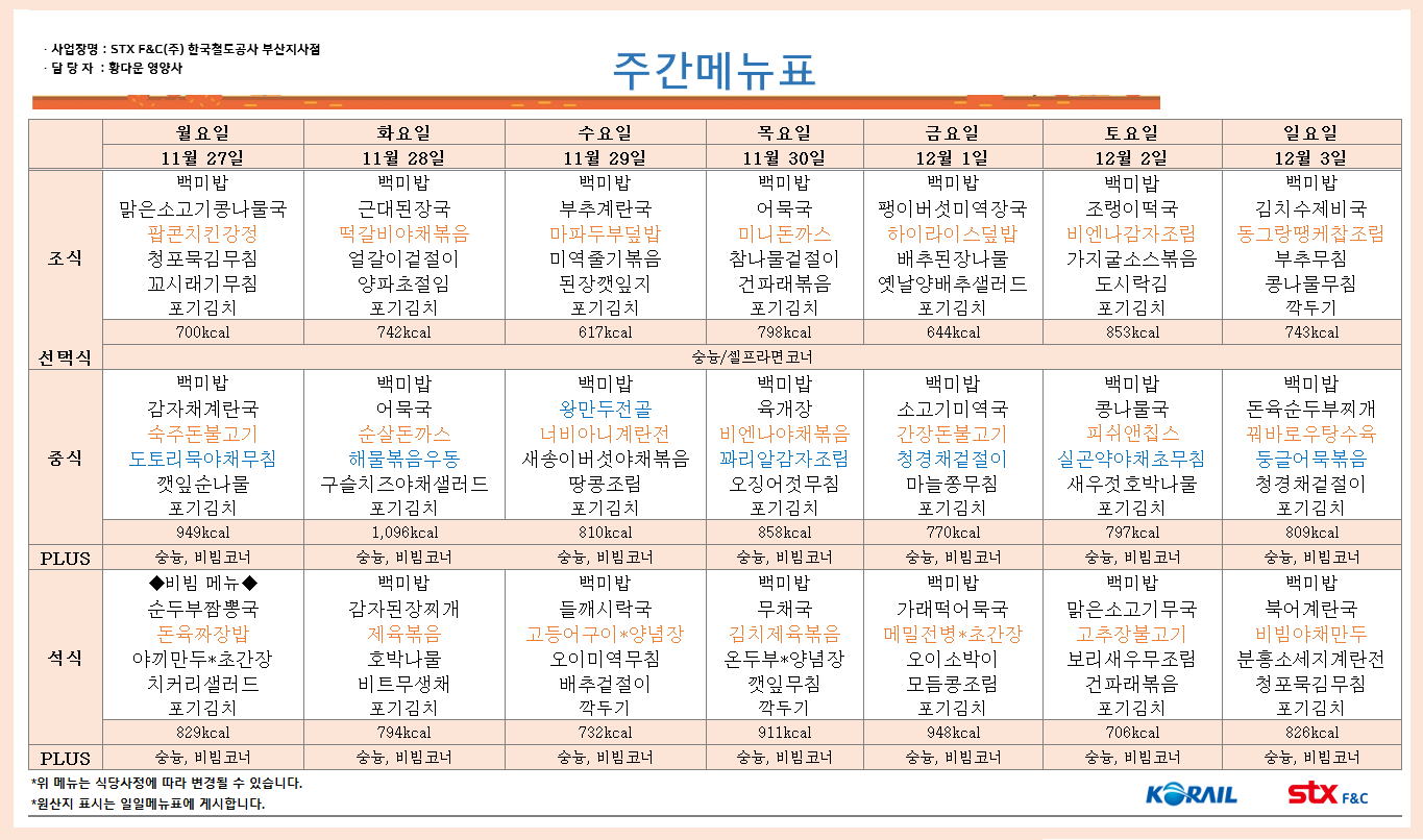 | 23-11-20 ~ 23-11-26 부산역 직원식당 메뉴 (1) | 2023.11.20 |