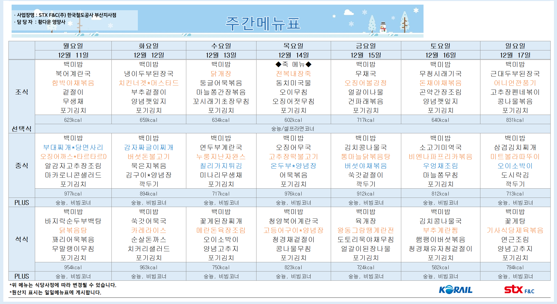 | 23-12-04 ~ 23-12-10 부산역 직원식당 메뉴 (1) | 2023.12.01 |