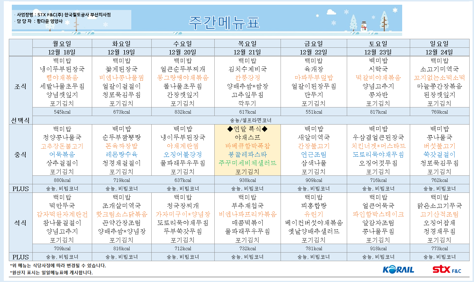 | 23-12-25 ~ 23-12-31 부산역 직원식당 메뉴 (1) | 2023.12.26 |