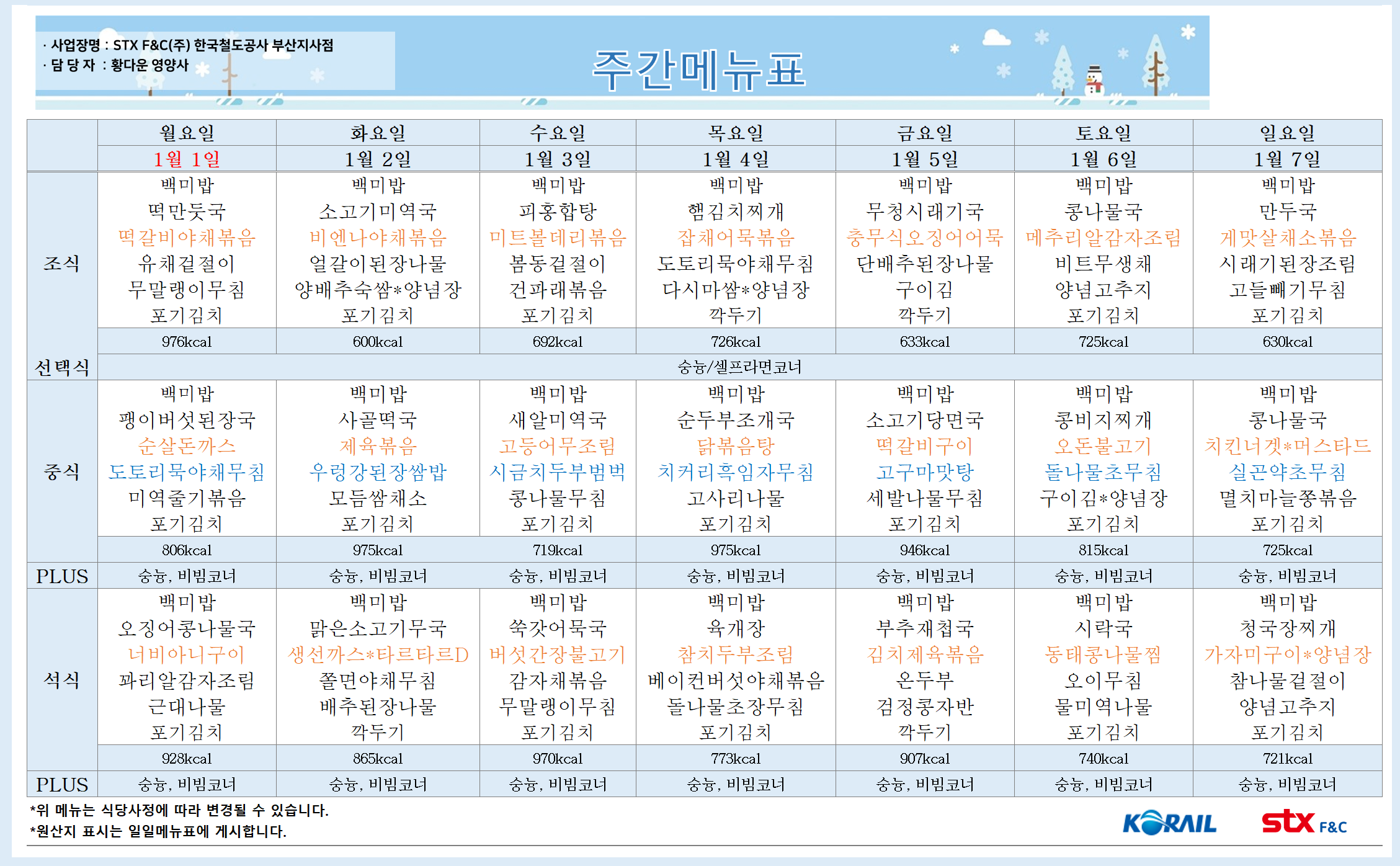| 24-01-15 ~ 24-01-21 부산역 직원식당 메뉴 (4) | 2024.01.12 |