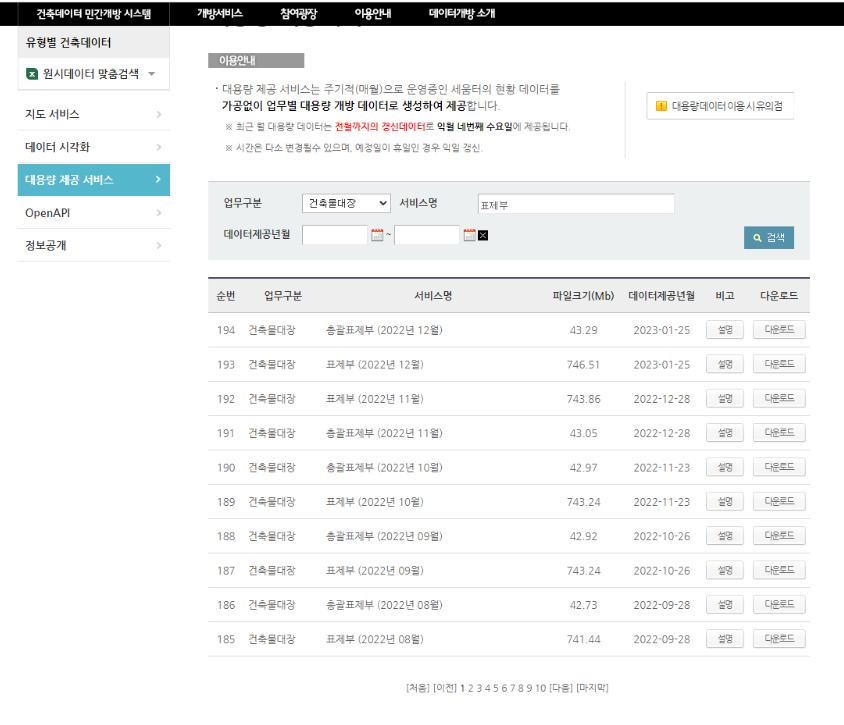 건축물 대장 검색창에서 업무구분은 건축물대장, 서비스명은 표제부로 검색하여, 가장 최근 자료를 다운로드 한다.