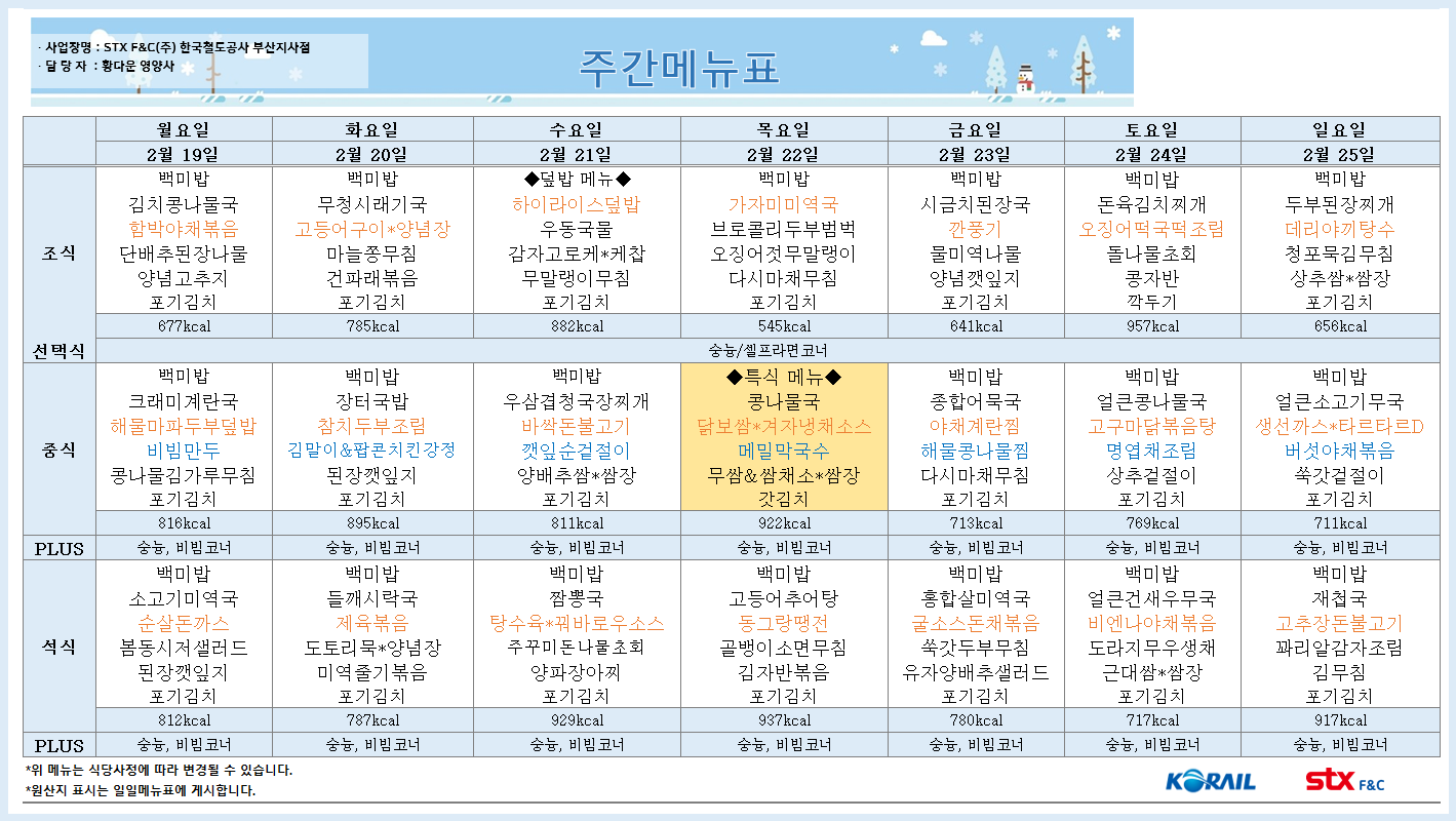 | 24-02-26 ~ 24-03-03 부산역 직원식당 메뉴 (2) | 2024.02.26 |