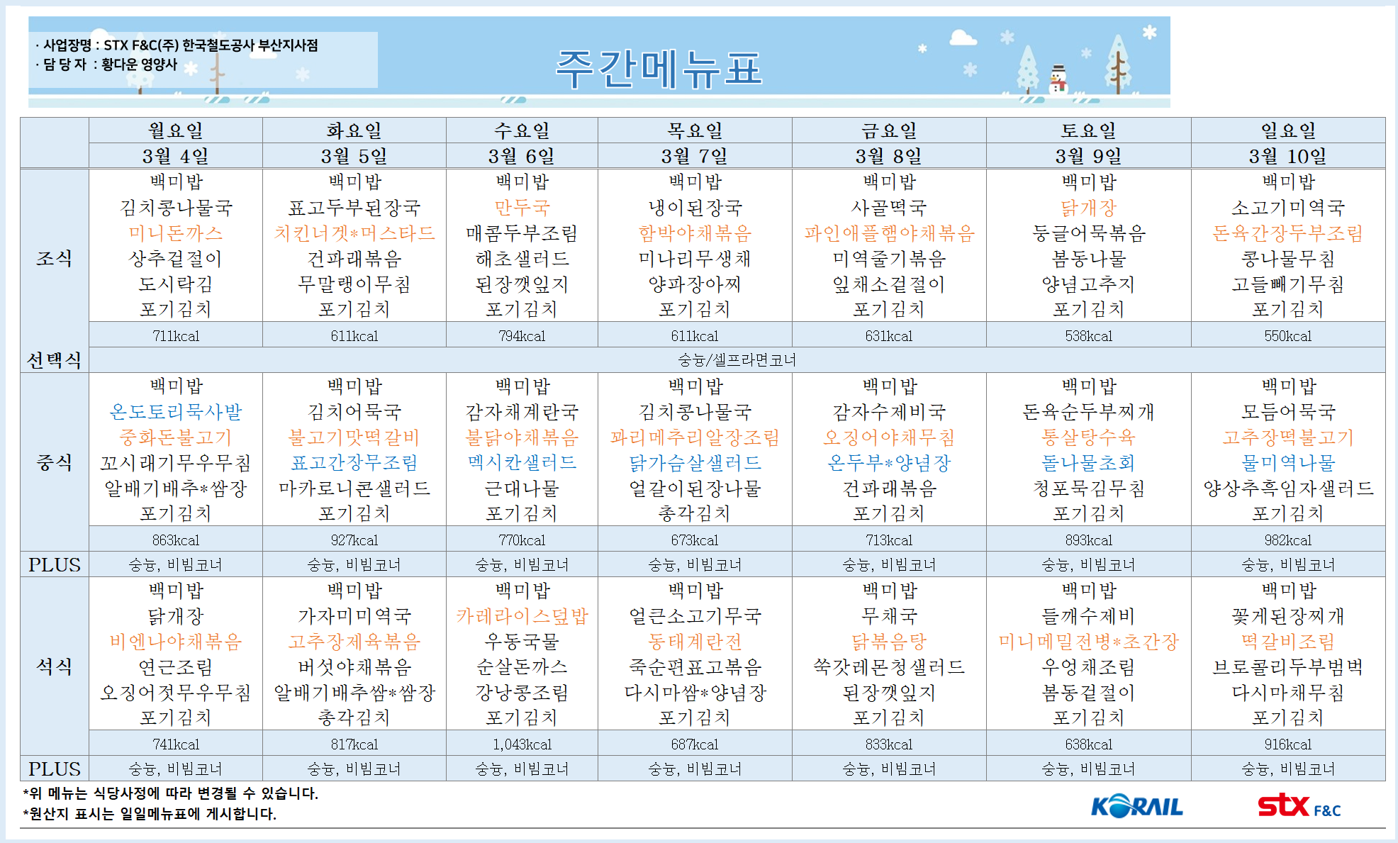 | 24-03-11 ~ 24-03-17 부산역 직원식당 메뉴 (7) | 2024.03.11 |