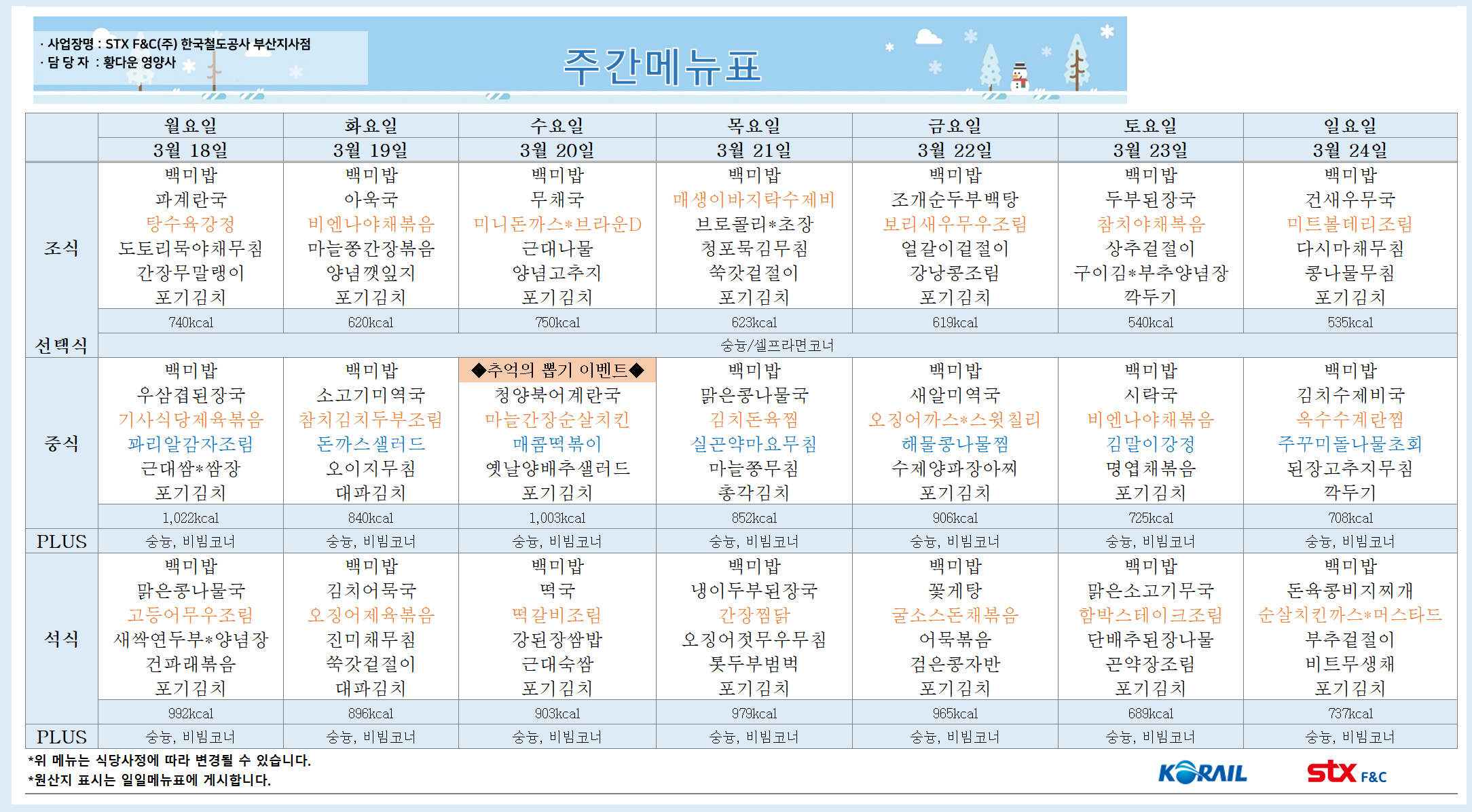| 24-03-25 ~ 24-03-31 부산역 직원식당 메뉴 (1) | 2024.03.25 |