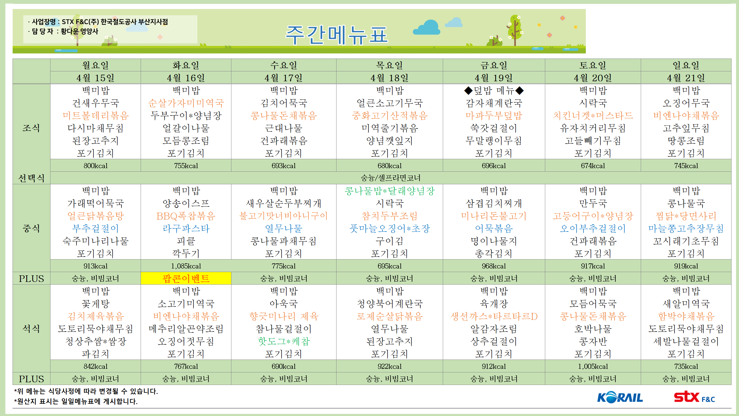 | 24-04-22 ~ 24-04-28 부산역 직원식당 메뉴 (2) | 2024.04.22 |
