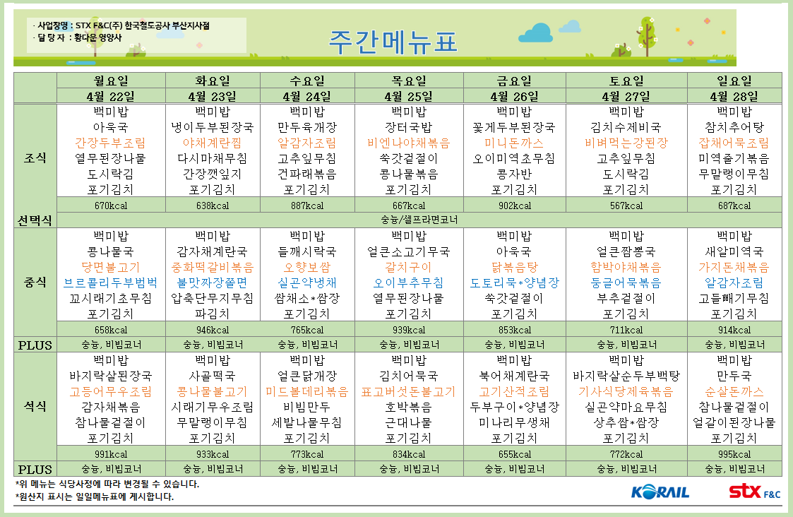 | 24-04-22 ~ 24-04-28 부산역 직원식당 메뉴 (2) | 2024.04.22 |