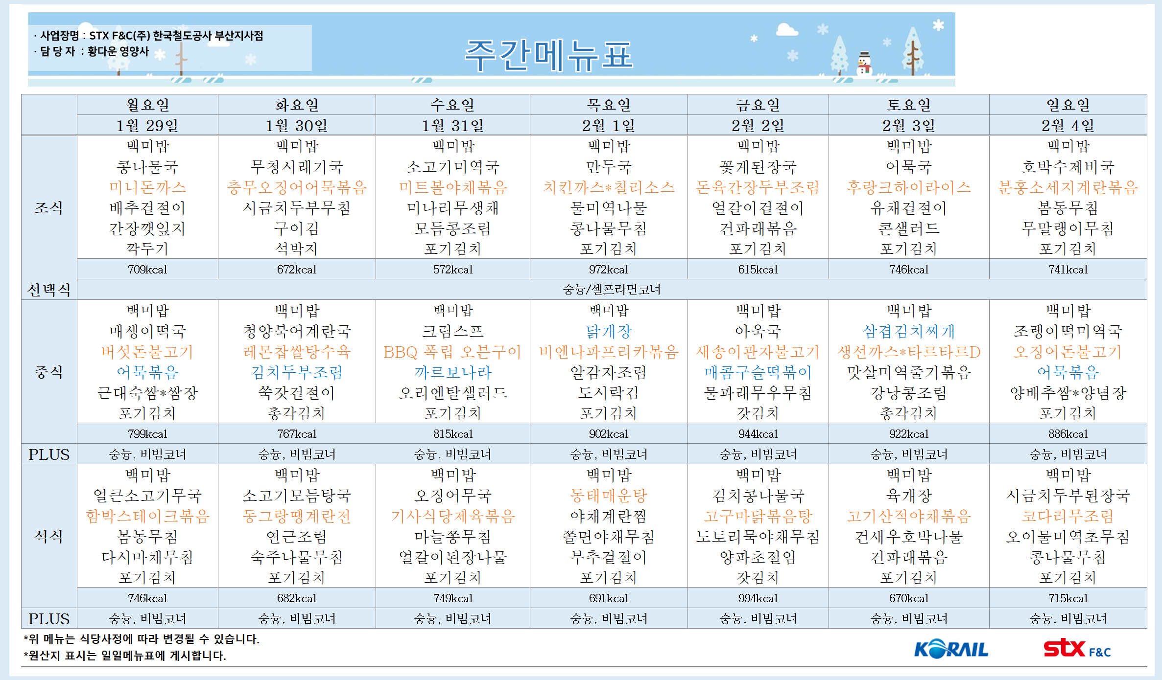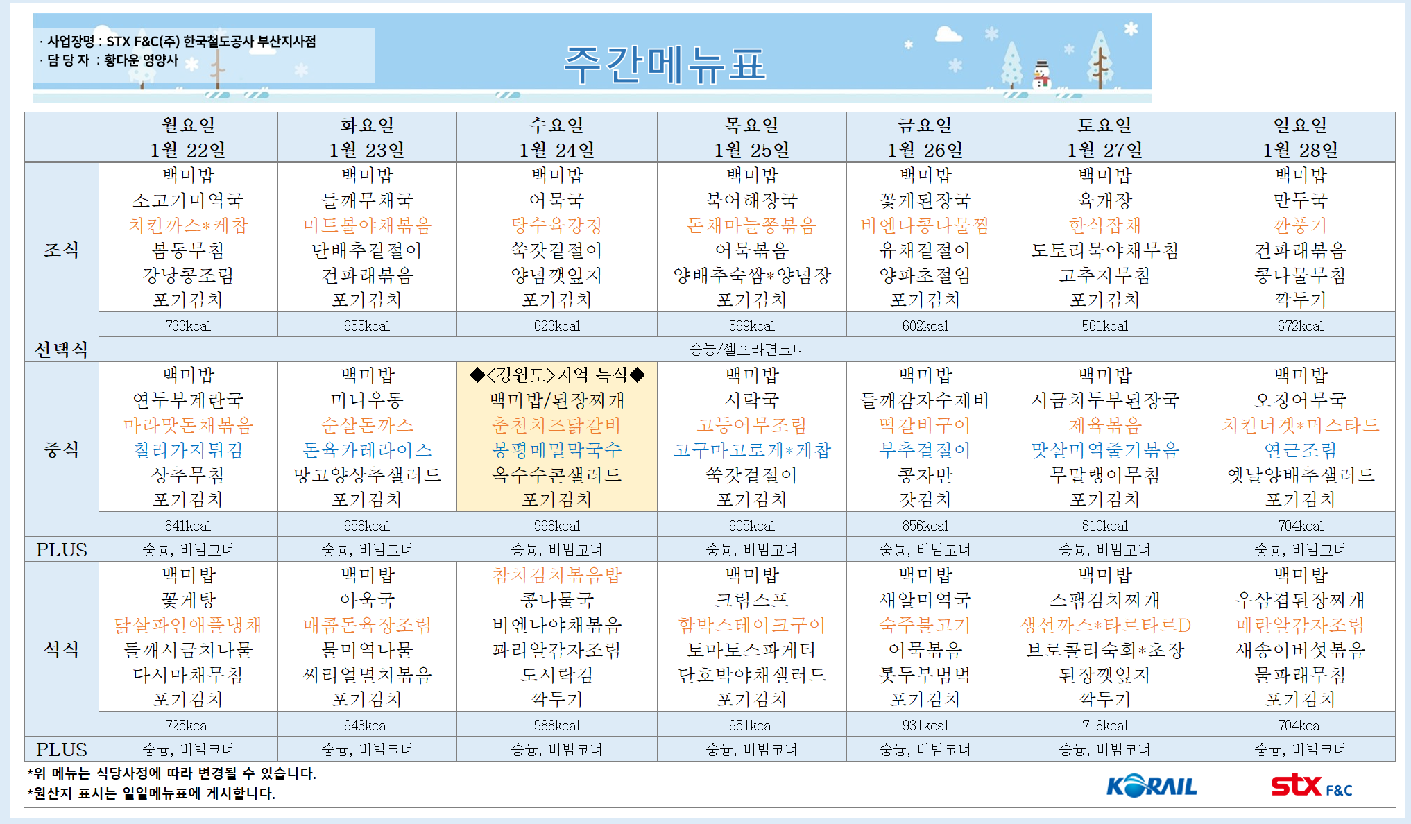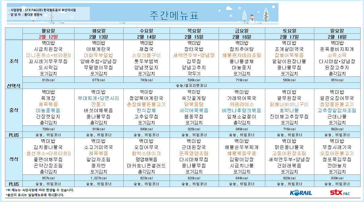 월요일 육개장: 매콤한 국물과 쫄깃한 면발, 풍부한 채소가 어우러져 든든한 한 끼 식사를 제공합니다. 제육볶음: 달콤짭짤한 양념에 볶은 제육볶음은 남녀노소 누구나 좋아하는 메뉴입니다. 마늘쫑볶음: 아삭한 마늘쫑과 매콤한 양념의 조합이 밥도둑 역할을 합니다. 간장깻잎지: 고소한 깻잎과 간장 양념이 어우러져 색감과 맛이 조화로운 메뉴입니다. 화요일 부대찌개: 다양한 재료가 들어가 푸짐하고 든든한 부대찌개는 당면사리와 함께 즐기면 더욱 맛있습니다. 깐풍기: 바삭하게 튀긴 깐풍기는 남녀노소 누구나 좋아하는 메뉴입니다. 버섯야채볶음: 향긋한 버섯과 다양한 채소가 어우러져 영양가 높은 메뉴입니다. 콩나물무침: 아삭한 콩나물과 간단한 양념의 조합이 간편하면서도 맛있는 메뉴입니다. 수요일 청양북어계란국: 시원한 국물과..